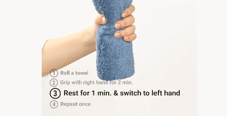 타월 혹은 수건을 말고, 한손으로 중앙을 2분동안 꽉 쥔 다음, 1분을 쉬워줍니다.
